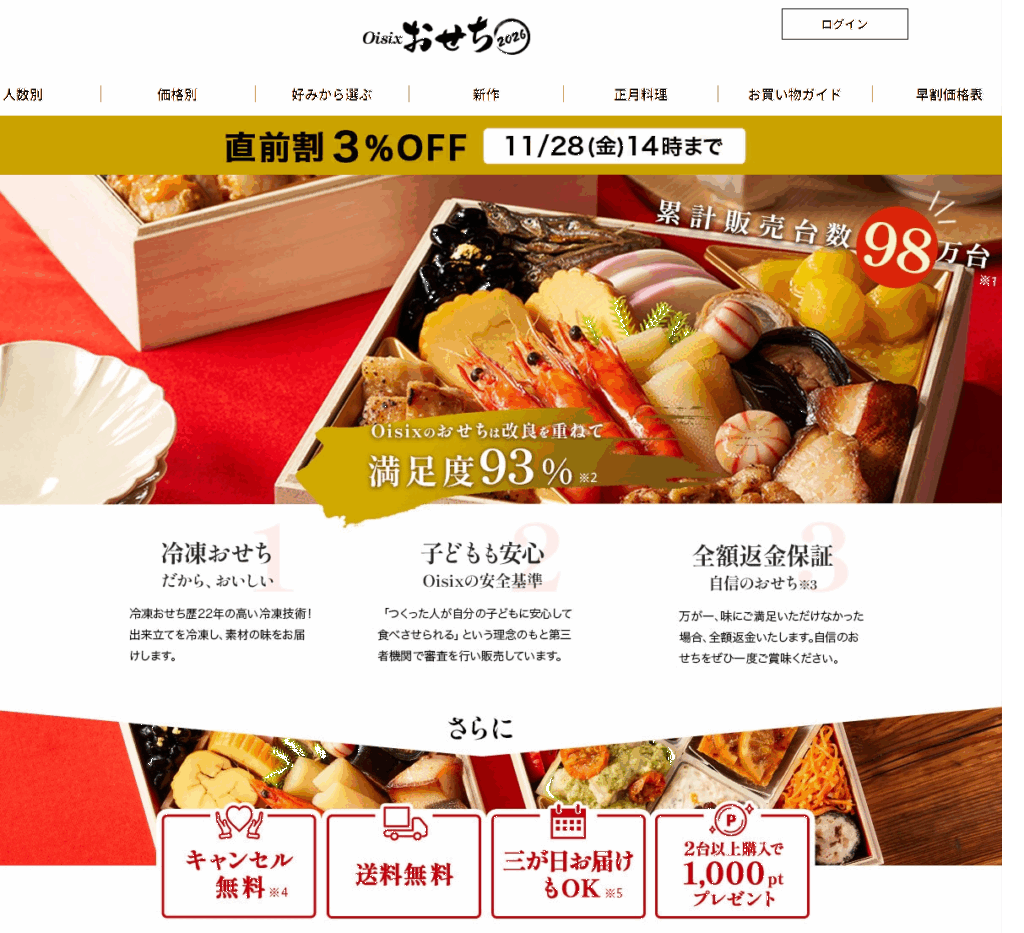 【PR】 Oisixのおせち 今回は冷凍おせち通販サイトの紹介です。おせち料理を追求し続け、毎年新しい工夫と味で勝負しているサイトです。定番から一風変わったおせち料理まで、好みに合ったものを選ぶことができます。◆おすすめポイント◆・早割あり・商品によっては三が日のお届けもOK・送料無料 詳細はこちらをクリック おすすめ商品 上高砂 23,980円 家族みんなで楽しみたい、和風の凝った品目を食べたい、洋風品目も一緒に楽しみたい方に。厳選した食材をひと手間かけた39品目です。 リニューアル1品目、新作3品目が登場します。 肉オードブル鳳雅 20,250 円 お肉が大好き!いろんな肉料理を楽しみたい、和風のおせちに飽きてしまった方に。肉好きに捧げる肉づくしのオードブルです。 心ゆくまで肉料理を楽しめます。 商材名 Oisixおせち運営者 MK※当サイトはアフィリエイトプログラムを利用し宣伝目的で作成しております。